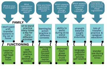 This case report describes the successful implementation of a supported-standing intervention to address multiple therapeutic goals. The F-words (functioning, family, fitness, fun, friends, future) help us focus on child and family strengths and promoting childhood development.4