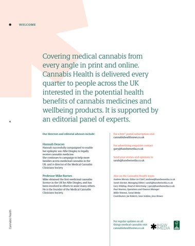 For a free* postal subscription visit cannabishealthnews.co.uk For advertising enquiries contact gary@handwmedia.co.uk Send your stories and opinions to sarah@handwmedia.co.uk