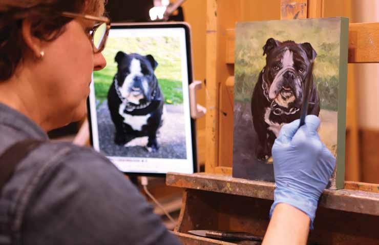 Most commissions are dogs, cats and horses. Live sittings don’t work well with wiggly pets. She was recently asked to paint a snail. That one might not be very wiggly or get very far. If it has fur or feathers, Lisa figures she has probably painted it. “I feel so grateful to be doing what I love, connecting with people through their animals, and being part of such a supportive community.”