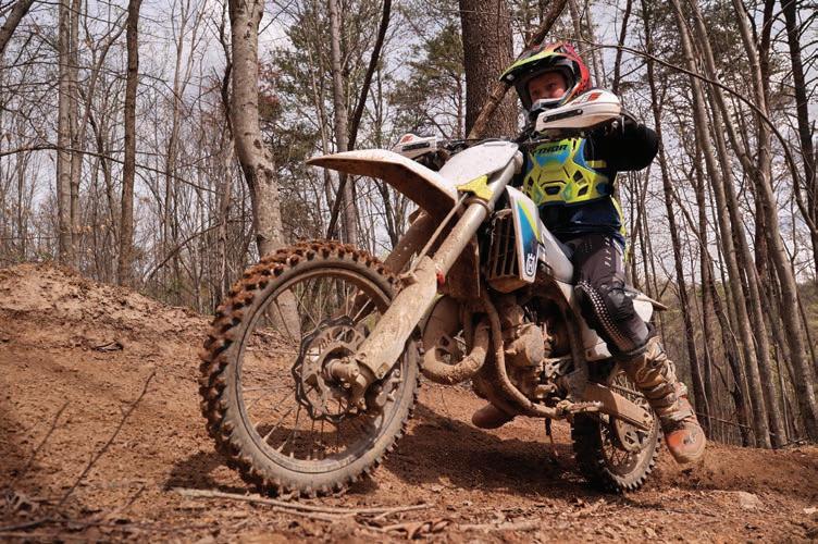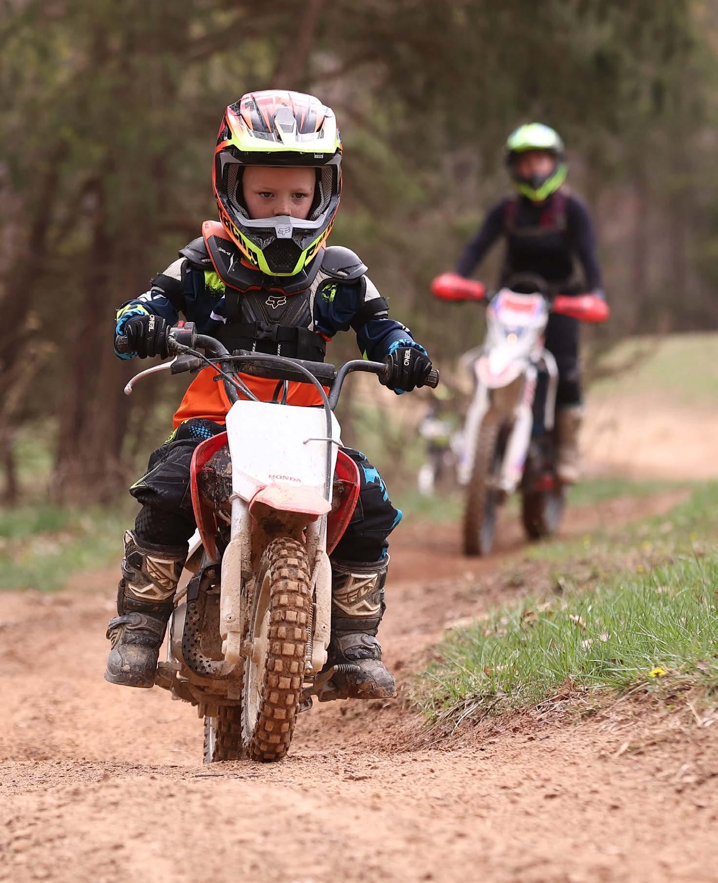 From there, Monica relates, they moved on to a Yamaha PW 50. Today, Drew (10) rides a Husqvarna 85, while Reece (5) has a Honda CRF 50. This mom rides a Beta X-Trainer (300), adding that knobbies are a must (for tires). “We ride the dirt bikes on wooded trails, through creeks and mud, anything that comes our way!” Initially, she explains, like on a PW 50, there are not any gears. After that one, they move up to a bike with a foot lever. Then you add the clutch