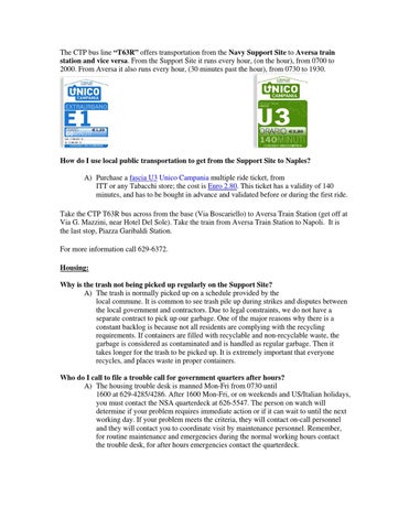 How do I use local public transportation to get from the Support Site to Naples? A) Purchase a fascia U3 Unico Campania multiple ride ticket, from ITT or any Tabacchi store; the cost is Euro 2.80. This ticket has a validity of 140 minutes, and has to be bought in advance and validated before or during the first ride. Take the CTP T63R bus across from the base (Via Boscariello) to Aversa Train Station (get off at Via G. Mazzini, near Hotel Del Sole). Take the train from Aversa Train Station to Napoli. It is the last stop, Piazza Garibaldi Station. For more information call 629-6372. Housing: Why is the trash not being picked up regularly on the Support Site? A) The trash is normally picked up on a schedule provided by the local commune. It is common to see trash pile up during strikes and disputes between the local government and contractors. Due to legal constraints, we do not have a separate contract to pick up our garbage. One of the major reasons why there is a constant backlog is because not all residents are complying with the recycling requirements. If containers are filled with recyclable and non-recyclable waste, the garbage is considered as contaminated and is handled as regular garbage. Then it takes longer for the trash to be picked up. It is extremely important that everyone recycles, and places waste in proper containers. Who do I call to file a trouble call for government quarters after hours? A) The housing trouble desk is manned Mon-Fri from 0730 until 1600 at 629-4285/4286. After 1600 Mon-Fri, or on weekends and US/Italian holidays, you must contact the NSA quarterdeck at 626-5547. The person on watch will determine if your problem requires immediate action or if it can wait to until the next working day. If your problem meets the criteria, they will contact on-call personnel and they will contact you to coordinate visit by maintenance personnel. Remember, for routine maintenance and emergencies during the normal working hours contact the trouble desk, for after hours emergencies contact the quarterdeck.