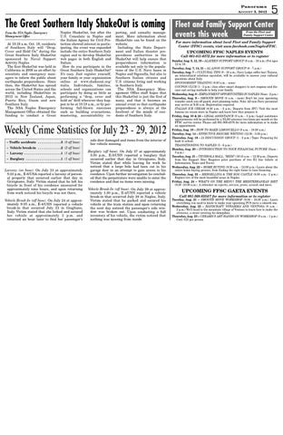 UPCOMING FFSC NAPLES EVENTS Call 081-811-6372 for more information or to register Sunday Aug. 5, 12, 19 – ALATEEN SUPPORT GROUP (9 a.m. - 10 a.m.) For ages 12 to 18. Tuesday, Aug. 7, 14, 21 – AL-ANON SUPPORT GROUP (6 - 7 p.m.) Tuesday, Aug. 7 – CULTURAL TIPS (9 - 10 a.m.; Navy Lodge coffee bar) Tiziana, an intercultural relations specialist, will be available to answer your cultural questions about Italy. SPONSORSHIP TRAINING (9:30 a.m. - noon) COUPON CLUB (1 - 2 p.m.) Join other smart shoppers to sort coupons and discuss cost saving methods to help your family. Wednesday, Aug. 8 – EMPLOYMENT OPPORTUNITIES IN NAPLES (Noon - 2 p.m.) Thursday, Aug. 9 – SMOOTH MOVE (8 a.m. - noon) Don’t let your upcoming transfer catch you off guard, start planning today. Note: All non-Navy personnel may arrive at 9:30 a.m. Registration required. ITALIAN ICE CREAM (8:30 a.m. - 2 p.m.; Departs from JFC) Visit the most famous ice cream store in Naples and learn how they prepare it. Friday, Aug. 10 & 24 – LEGAL ASSISTANCE (9 a.m. - 3 p.m.) Legal assistance appointments will be performed by a NLSO attorney two times per month at the FFSC service center. Please call 081-568-4576 for more information or to make an appointment. Friday, Aug. 10 – HOW TO MAKE LIMONCELLO (9 a.m. - 10:30 a.m.) Tuesday, Aug. 14 – EFFECTIVE RESUME WRITING (12:30 - 3:30 p.m.) Thursday, Aug. 16 – IA DISCUSSION GROUP (1 - 2 p.m.) Topic: Preparing for back to school. TRANSITIONING TO NAPLES (5 - 6 p.m.) Monday, Aug. 20 − INTRODUCTION TO YOUR FINANCIAL FUTURE (Noon 3 p.m.) Tuesday, Aug. 21 − TEVEROLA MALL, “MEDI” (10:15 a.m. – 12:30 p.m.; Departs from the Support Site) Requires prior purchase of two E1 bus tickets at Information, Tours and Travel. Wednesday, Aug. 22 − HOME BUYING (9:30 a.m. - 12:30 p.m.) Learn about the entire home buying process, from finding the right home to loan financing. Thursday, Aug. 23 − MERGELLINA & THE EGG CASTLE (8:30 a.m.- 2 p.m.) Explore two of the most beautiful areas in Naples. Friday, Aug. 24 − WHAT’S ON THE MENU? THE MEDITERRANEAN DIET (9:30 -10:30 a.m.) A refresher on coperto, servizio, primi, secondi and more.