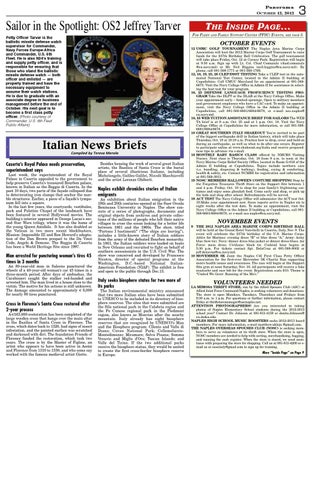 12 USMC GOLF TOURNAMENT The Naples Area Marine Corps Association will host the 2012 Marine Corps Golf Tournament to raise funds for the 237th Birthday Ball Celebration. The golf tournament will take place Friday, Oct. 12 at Carney Park. Registration will begin at 9:30 a.m. Sign up with Lt. Col. Chad Comunale (chad.comunale @eu.navy.mil) or Mr. Neil Higgins (neil.higgins@eu.navy.mil). By phone, call 081-568-1771 or 081-568-1769. 12, 16, 19, 23, 26 CLEP/DSST TESTING Take a CLEP test in the automated National Test Center, located in the Admin II building at Capodichino. Call UMUC Maryland for an appointment at 081-5686675. Visit the Navy College Office in Admin II for assistance in selecting the best test for your program. 16, 23 DEFENSE LANGUAGE PROFICIENCY TESTING PROGRAM Take the DLPT or the DLAB at the Navy College Office. Make your appointment early – limited openings. Open to military members and government employees who have a CAC card. To make an appointment, visit the Navy College Office in the Admin II building at Capodichino, call 081-568-6681/6684/6678, or e-mail nco.naples@ eu.navy.mil. 18, 25 WEB TUITION ASSISTANCE BRIEF FOR SAILORS The WEB TA brief is at 9 a.m. Oct. 25 and at 1 p.m. Oct. 18. Visit the Navy College Office at Capodichino for more information, or call 081-5686681/6684/6678. 18 GREAT SOUTHERN ITALY SHAKEOUT You're invited to be part of the biggest earthquake drill in Italian history, which will take place Thursday, Oct. 18 at 10:18 a.m. Practice how to drop, cover and hold on during an earthquake, as well as what to do after one occurs. Register to participate online at www.shakeout.org/italia and receive preparedness tips in advance via e-mail. 18 MONTHLY BABY BASICS CLASS offered by NMCRS Visiting Nurses. Next class is Thursday, Oct. 18 from 9 a.m. to noon at the Navy-Marine Corps Relief Society Office, located in Room G-016 of the Admin II building at Capodichino. Topics include newborn care (i.e. bundling, diapering & bathing), feeding, crying & comforting, health & safety, etc. Contact NCMRS for registration and information at 081-568-3913. 19 NOSC MEMBERS HALLOWEEN COSTUME SHOPPING Stop by the Forgotten Treasures Thrift Store on the Support Site between 1 and 4 p.m. Friday, Oct. 19 to shop for your family’s frightening costumes and enjoy some ghoulish food. Come early and shop, or pick up the kids and shop after school. Refreshments will be served. 19 ACT TEST The Navy College Office will administer the ACT test Oct. 19.Make your appointment now. Score reports arrive in Naples six to eight weeks after the test date. To make an appointment, visit the Navy College Office in the Admin II building at Capodichino, call 081568-6681/6684/6678, or e-mail nco.naples@eu.navy.mil.
