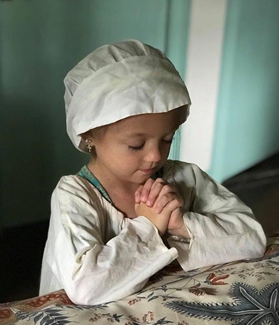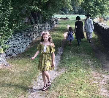 This issue of Dames Discovery leads with a series of articles on giving and gratitude. From Mary Mundy’s grateful message to a piece on planned giving to one about the quiet power of volunteerism, it is clear that Dames are generous. The Martin House Farm (established in 1735) in Swansea, MA, was gifted to the Massachusetts Dames in 1930. It is an exceptional property with over 50 acres and a house that dates to the earliest days in New England. Today, Martin House Farm opens its doors to the public, thriving as an education and community facility. Like other house museums, programming plays a big role and there are 18th century enactments throughout the season. Photos recently taken on the grounds illustrate what it must have been like in 1735. On our cover, young Reagan Martin is kneeling and praying. Reagan is directly descended from John Martin, the farm’s founder. She belongs to either the seventh or eighth generation removed, depending on how you read her geneology. Her gentle face, clasped hands and pious posture fit perfectly well with the theme of giving and gratitude. Her older sister London is in the featured photos too.