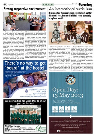 13 students are encouraged into leadership roles to promote the family atmosphere of the boarding community amongst all 150 boarders. Nelson College for Girls provides students with strong academic opportunities and we are proud of our record of academic excellence. Programmes for students with special abilities are also provided to meet the individual needs of all students. Students are all encouraged to be involved in the many sporting and cultural aspects of school life. Our House competitions are an important aspect of the College and boarders have access to local clubs. Enrolments are now being accepted for 2014. For more information contact Pauline Auchinvole on 03 548 3104 Ext 856, email: boarding@ncg.school.nz or visit our website: www.ncg.school.nz/boarding.