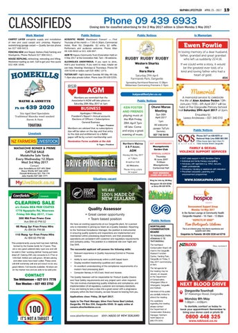 Closing date for classified advertising for the 2 May 2017 edition is 10am Monday 1 May 2017 Public Notices