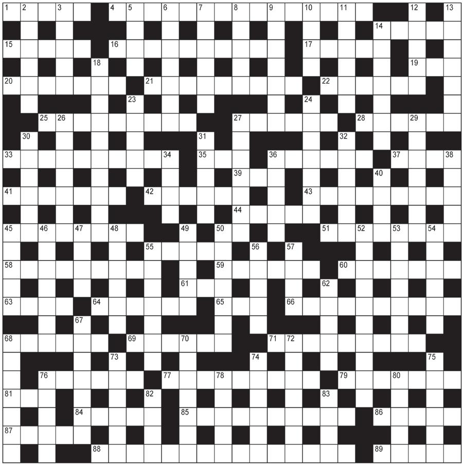 ACROSS: 1 Adobe, 4 Cigarette paper, 11 Clubs, 14 Sneak, 15 Encompassed, 16 Attorney, 19 Saddles, 20 Hairy, 21 Albatross, 24 Flotation, 26 Madrid, 27 Donate, 31 Limbs, 32 Operetta, 34 Cathedrals, 38 Spirits, 39 Adored, 40 Abused, 41 Core, 42 Cyclone, 45 Borderline, 50 Special, 54 Unit, 55 Recess, 56 Cotton, 57 Engrave, 60 Highlights, 61 Suspense, 62 Roost, 65 Munich, 66 Cloned, 67 Economist, 72 Aspersion, 73 Diary, 74 Flaming, 79 Credited, 80 Endorsement, 81 Steak, 82 Depth, 83 As the crow flies, 84 Grate. DOWN: 2 Denial, 3 Board, 5 Inns, 6 Avocado, 7 Expire, 8 Tusk, 9 Preclude, 10 Return, 11 Crossroads, 12 Ulna, 13 Skyline, 17 Petty, 18 Caricature, 22 Stops, 23 Macaroni, 25 Liberal, 26 Meander, 28 Biopsy, 29 Stared, 30 Sheets, 33 Radio, 35 Shell, 36 Stun, 37 Taxi, 42 Couch, 43 Clinging, 44 Emerge, 45 Breathless, 46 Rest, 47 Excused, 48 Latest, 49 Noose, 51 Pond, 52 Curious, 53 Advise, 58 Blacksmith, 59 Using, 63 Announce, 64 Ample, 65 Menaced, 68 Caramel, 69 Geneva, 70 Jigsaw, 71 Intact, 75 Meter, 76 Jeep, 77 Boar, 78 Knee.