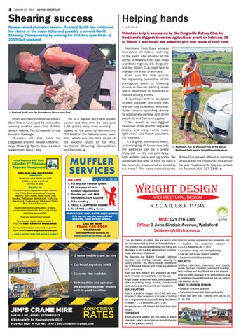 Northland Field Days attracts thousands of visitors each day to the event site situated at the corner of Awakino Point East Road and State Highway 14, Dargaville and the Rotary Club need help to manage the influx of vehicles. Each year the club assists the organising committee of the prestigious event by directing drivers in the car parking areas and is dependant on residents or visitors lending a hand. A four-hour shift is assigned to each volunteer and more than one day may be worked. Volunteer duties involve assisting drivers to appropriate parking and direct people to and from entry gates. “This event is our biggest fundraiser of the year for Dargaville Rotary, and many hands make light work,” said Rotary president, Viv Trounsen. “It’s a great community event, and wrangling all those cars into p Volunteers play an important role at the annual the paddocks can be a pretty Northland Field Days in the public parking areas tricky job — it’s not just fancy high visibility vests and big sticks. We Rotary Club are well utilised in assisting appreciate any offer of help, for even a others within the community throughout few hours, to ensure another smoothly the year. People keen to help can contact run event.” The funds received by the Viv Trounson 021 217 3346. ¢