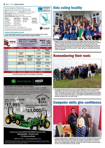 The Kaipara Lifestyler is published with pride by NorthSouth Multi Media Ltd, a privately owned Kaipara company. Phone: 09 439 6933 or 0800 466 793 • Fax: 09 439 6930 Email: info@thelifestyler.co.nz • Postal Address: PO Box 474, Dargaville Physical Address: Lifestyler House, 107 River Road, Dargaville General Manager: Deb Wright | 021 639 696 Kaipara Lifestyler Editor at large: Paul Campbell 09 439 6933 Editorial: Andy Bryenton Ann Morgan Ayla Miller Brian Eastwood Rose Stirling