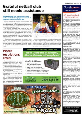 It has taken just three years for Northpower to build New Zealand’s first ultra-fast broadband network and it couldn’t have been done without the immense support from local people and local authorities. It is something Whangarei can be immensely proud of and we should get ready to celebrate! Connecting is easy All you have to do to get connected, is check out the build map (click on the Coverage tab) on the Northpower Fibre website to see if fibre is at your door, go to the Partners page and choose a broadband provider. Any questions phone Northpower Fibre on 0800 667 847 or follow Northpower Fibre on facebook - facebook.com/ northpowerfibre.