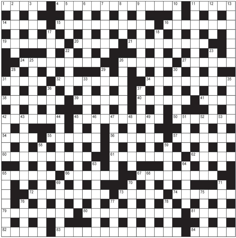 ACROSS: 1 Lacquer, 4 Phenomenon, 9 Brittle, 13 Slag, 14 Stress, 15 Tickle, 16 Bigoted, 19 Remunerate, 20 Paradise, 21 Divan, 24 Sermon, 25 Chores, 27 Appaloosa, 32 Telegram, 33 Ageing, 34 Elevate, 38 Torments, 39 Invert, 40 Crew, 41 Aside, 42 Night, 45 Rattle the sabre, 52 Havoc, 55 Gravy, 56 Clan, 57 Fasten, 58 Scenario, 61 Secrets, 62 Serene, 63 Domestic, 66 Isolation, 68 Ornate, 69 Friend, 73 Oasis, 74 Sailboat, 76 Disinfects, 81 Visible, 82 Absorb, 83 Useful, 84 Plan, 85 Moisten, 86 Mysterious, 87 Dressed. DOWN: 1 Loser, 2 Claymore, 3 Return, 4 Pleat, 5 Ease, 6 Octopus, 7 Escort, 8 Oiled, 10 Ruin, 11 Tropics, 12 Leeway, 17 Incoherent, 18 Usual, 22 Criminal, 23 Moult, 24 Shorten, 26 Harp, 28 Panacea, 29 Pester, 30 Pestle, 31 Studio, 33 Agent, 35 Vesta, 36 Brag, 37 Tear, 43 Israel, 44 Hover, 46 Able, 47 Tangelo, 48 Eiffel, 49 Haste, 50 Sledding, 51 Excuse, 52 Handicraft, 53 Vary, 54 Clogged, 59 Stalk, 60 Omit, 64 Steal, 65 Hercules, 67 Spirits, 68 October, 70 Casino, 71 Bow out, 72 Liquid, 75 Lobby, 77 Ideas, 78 Synod, 79 Flue, 80 Sumo.
