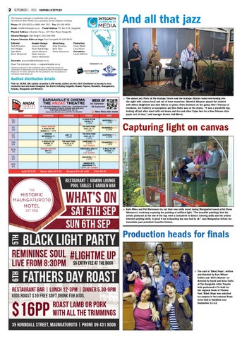 The Kaipara Lifestyler is published with pride by NorthSouth Multi Media Ltd, a privately owned Kaipara company. Phone: 09 439 6933 or 0800 466 793 • Fax: 09 439 6930 Email: info@thelifestyler.co.nz • Postal Address: PO Box 474, Dargaville Physical Address: Lifestyler House, 107 River Road, Dargaville General Manager: Deb Wright | 021 639 696 Kaipara Lifestyler Editor at large: Paul Campbell 09 439 6933 Editorial: Andy Bryenton Ann Morgan Ayla Miller Brian Eastwood