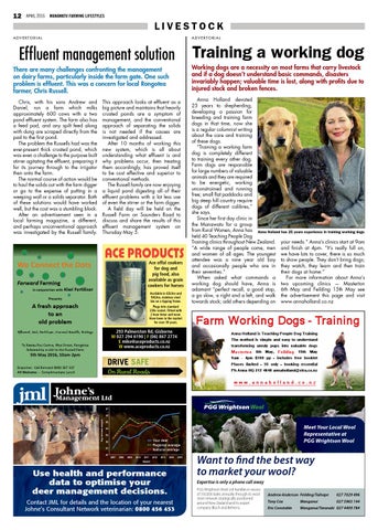 Anna Holland devoted 25 years to shepherding, developing a passion for breeding and training farm dogs in that time, now she is a regular columnist writing about the care and training of these dogs. “Training a working farm dog is completely different to training every other dog. Farm dogs are responsible for large numbers of valuable animals and they are required to be energetic, working unconstrained and running free; small flat paddocks and big steep hill country require dogs of different calibres,” she says. Since her first day clinic in the Manawatu for a group from Rural Women, Anna has Anna Holland has 25 years experience in training working dogs held 40 Teaching People Dog Training clinics throughout New Zealand. your needs.” Anna’s clinics start at 9am “A wide range of people come, men and finish at 4pm. “It’s really full on, and women of all ages. The youngest we have lots to cover, there is so much attendee was a nine year old boy to show people. They don’t bring dogs; and occasionally people who are in they watch, they learn and then train their seventies.” their dogs at home.” When asked what commands a For more information about Anna’s working dog should have, Anna is two upcoming clinics — Masterton adamant “perfect recall, a good stop, 6th May and Feilding 15th May see a go slow, a right and a left, and walk the advertisement this page and visit towards stock; add others depending on www.annaholland.co.nz