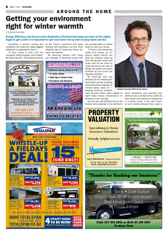 are causing water to collect under or near your house. “If there’s still dampness under your house, an onground vapour barrier can stop the moisture rising up from the ground inside and make sure all the vents to under the house are clear of things like plants and porch furniture so your home can naturally ventilate.” Mr Hoerning also has everyday tips for keeping your home warm and dry, including opening windows regularly to remove damp, stale air — p Christian Hoerning, EECA Senior Advisor keeping bedroom windows (with security stays) open slightly at when showering, and ensuring your night helps reduce condensation on clothes dryer is vented to the outside all windows in the morning. help prevent the build-up of dampness You can also use extractor fans in the in a winter home. If you don’t have, kitchen when cooking, in the bathroom or can’t install extractor fans, open a