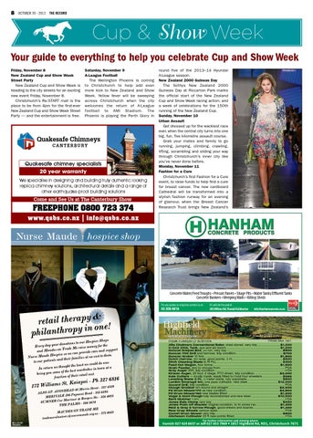 round five of the 2013–14 Hyundai A-League season. New Zealand 2000 Guineas Day The Sothys New Zealand 2000 Guineas Day at Riccarton Park marks the official start of the New Zealand Cup and Show Week racing action, and a week of celebrations for the 150th running of the New Zealand Cup. Sunday, November 10 Urban Assault Get dressed up for the wackiest race ever, when the central city turns into one big, fun, five kilometre assault course. Grab your mates and family to go C a n t e r b u ry running, jumping, climbing, crawling, lifting, scrambling and sliding your way through Christchurch’s inner city like you’ve never done before. Quakesafe chimney specialists 20 year warranty Monday, November 11 Fashion for a Cure 20 year warranty Christchurch’s first Fashion for a Cure We specialise in designing and building truly authentic looking to raise funds to help find a cure ATS NEWS AUGUST event, 2013—hANhAm 1/2PG ADVERT replica chimney solutions, architectural details and a range of for breast cancer. The new cardboard other earthquake proof building solutions Cathedral will be transformed into a stylish fashion runway for an evening Come and See us at the Canterbury Show of glamour, when the Breast Cancer Research Trust brings New Zealand’s