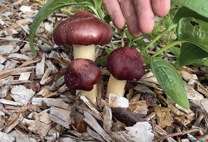 King stropharia, also known as garden giant or winecap mushrooms, in the garden of mycologist Paul Stamets.