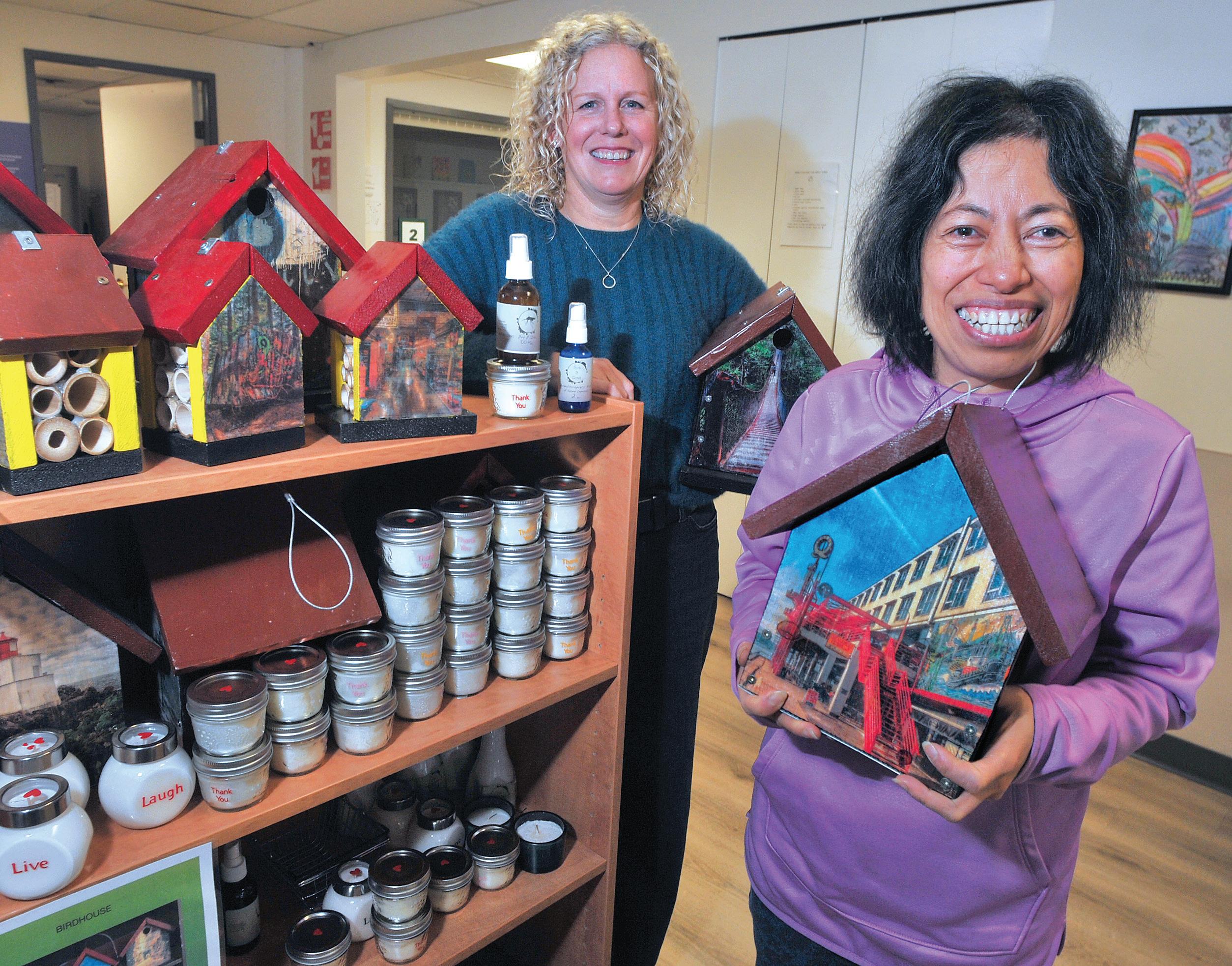 North Shore Disability Resource Centre manager of communications and development Teri Taylor (left) and front desk assistant Emilie Narcise show off bird feeders and scented candles created by NSDRC clients that will be on sale at their fundraising Gala at the Shipyards Thursday, April 9. PAUL MCGRATH / NSN