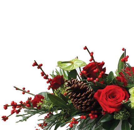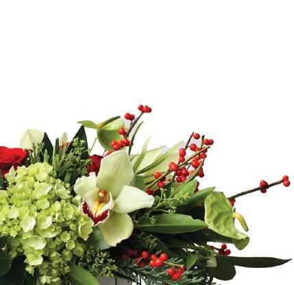 Vibrantandlush,thismodernarrangementfeaturesclassicredroses,green cymbidiumorchids,ilexberriesandfragrantwintergreens.Pre-orderforyour holidaycentrepieceorgifttoalovedone! $175