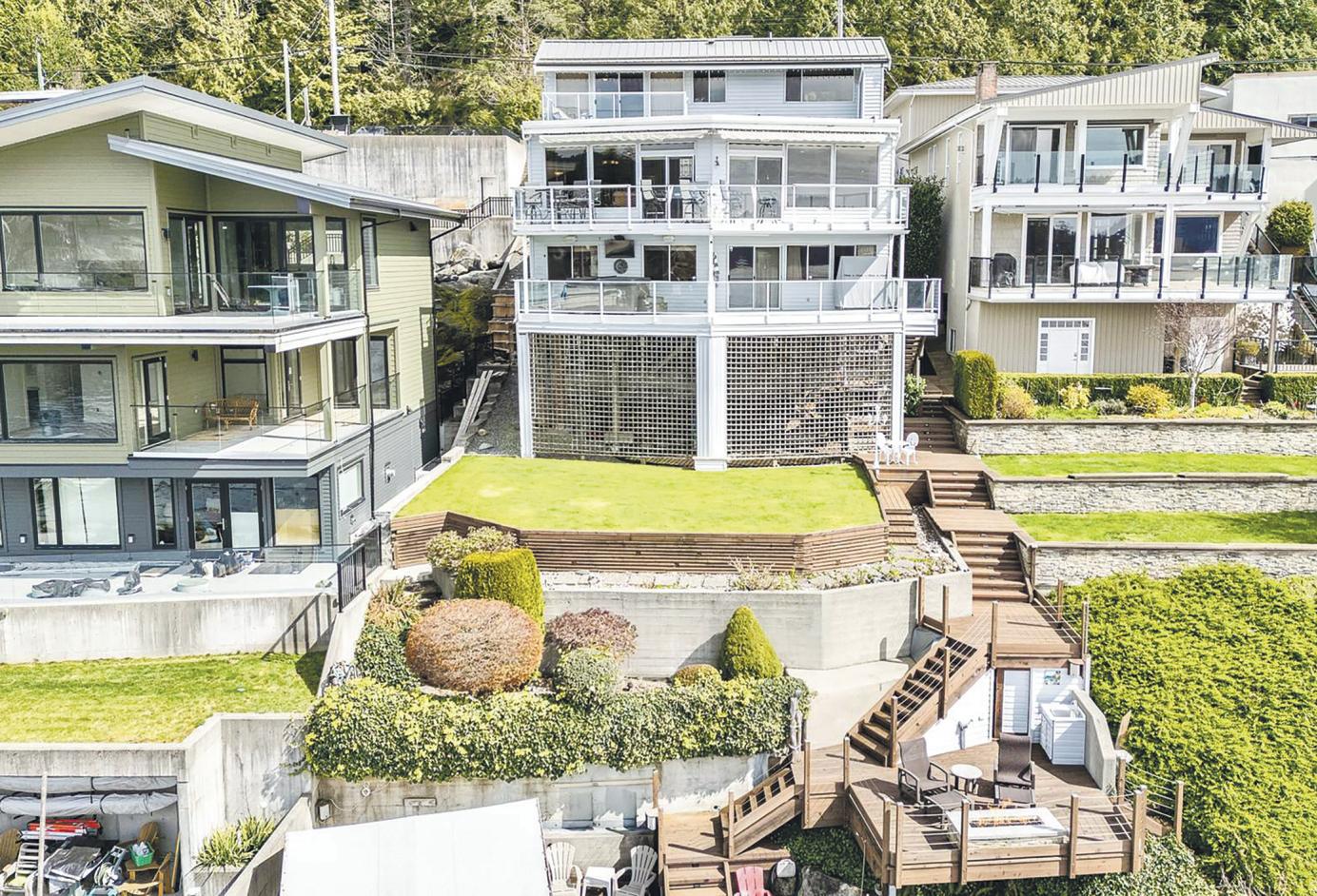 This 5,000 que properties inWest Vancouver. waterfront peninsulahas nearly 400 feet its fortress-like concrete foundation pool and secluded beaches while watching and sunsets of Howe Sound, the islandsa t4 years ago, constructed of steeland walls of windows to maximize the views avery wellequipped gym, and