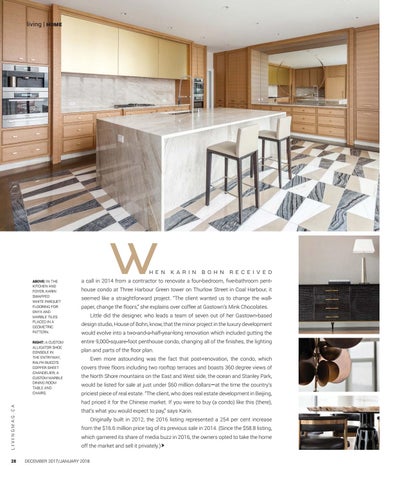 C ECNN KP HTQO C EQPVTCEVQT VQ TGPQXCVG C HQWT DGFTQQO Ć’XG DCVJTQQO RGPVhouse condo at Three Harbour Green tower on Thurlow Street in Coal Harbour, it seemed like a straightforward project. “The client wanted us to change the wallpaper, change the floors,â€? she explains over coffee at Gastown’s Mink Chocolates. Little did the designer, who leads a team of seven out of her Gastown-based design studio, House of Bohn, know, that the minor project in the luxury development would evolve into a two-and-a-half-year-long renovation which included gutting the GPVKTG USWCTG HQQV RGPVJQWUG EQPFQ EJCPIKPI CNN QH VJG Ć’PKUJGU VJG NKIJVKPI plan and parts of the floor plan. Even more astounding was the fact that post-renovation, the condo, which covers three floors including two rooftop terraces and boasts 360 degree views of the North Shore mountains on the East and West side, the ocean and Stanley Park, would be listed for sale at just under $60 million dollars—at the time the country’s priciest piece of real estate. “The client, who does real estate development in Beijing, had priced it for the Chinese market. If you were to buy (a condo) like this (there), that’s what you would expect to pay,â€? says Karin. Originally built in 2012, the 2016 listing represented a 254 per cent increase from the $16.6 million price tag of its previous sale in 2014. (Since the $58.8 listing, which garnered its share of media buzz in 2016, the owners opted to take the home off the market and sell it privately.)