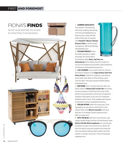 2 PITCHER PERFECT: Ideal for holding sangria or spiked lemonade, this handcrafted, mouth-blown glass Basic Jug from Lsa International will be adding a punch of colour to my summer barbecues and parties. $60 at Atkinson’s of Vancouver, atkinsonsofvancouver.com