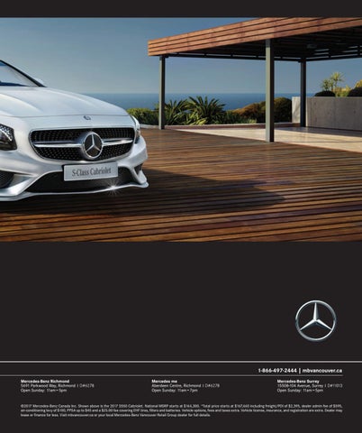 ©2017 Mercedes-Benz Canada Inc. Shown above is the 2017 S550 Cabriolet. National MSRP starts at $164,300. *Total price starts at $167,460 including freight/PDI of $2,395, dealer admin fee of $595, air-conditioning levy of $100, PPSA up to $45 and a $25.00 fee covering EHF tires, filters and batteries. Vehicle options, fees and taxes extra. Vehicle license, insurance, and registration are extra. Dealer may lease or finance for less. Visit mbvancouver.ca or your local Mercedes-Benz Vancouver Retail Group dealer for full details.