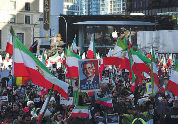 On Saturdayevening,peoplebegan gatheringalongLonsdale AvenueinNorth Vancouver,wavingIranianflagsoutside localbusinesses. Withinanhour,the crowdhadgrownlargeenoughthatpolice temporarilyclosedpartofthestreetto ensuresafety.