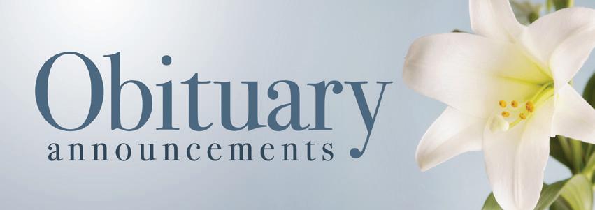To place an Obituary,InMemoriam, or Memorial Service, please callAdamat 236-889-6595 or email ahogan@glaciermedia.ca