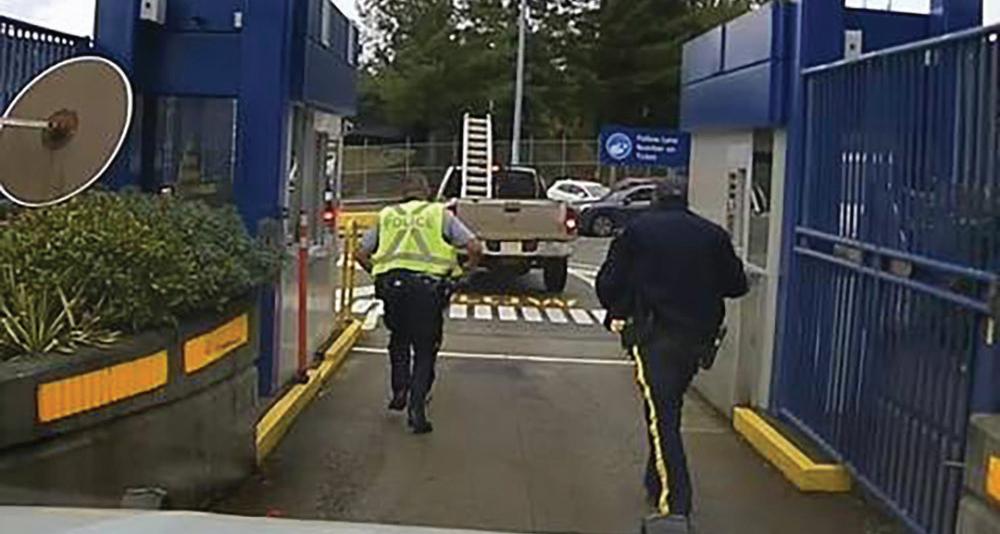 Two BC Highway Patrol officers run to stop a pickup truck at Horseshoe Bay ferry terminal in West Vancouver on Nov. 2. BC HIGHWAY PATROL