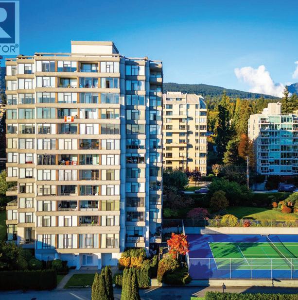 EMBRACE THE AMBLESIDE SEASIDE LIFESTYLE! Savour gorgeous close-in OCEAN VIEWSofthe Lions Gate Bridge, city, harbour &mountains from this quiet SE cornerhome. This bright,airy 2-bedroom +den suite offers generous room sizes, oversized windows, and insuite laundry —perfect for comfortable one-level living. THEWESTERLIES is asought-after, solid concrete building known for its beautifully manicuredgardens and friendly community. Enjoy amenities including tennis courts, saunas, workshop, secure parking, and wheelchair access. Recent updates include repiping (2022), new elevators (2024), roof &more. Includes parking, storage locker, and newer appliances.
