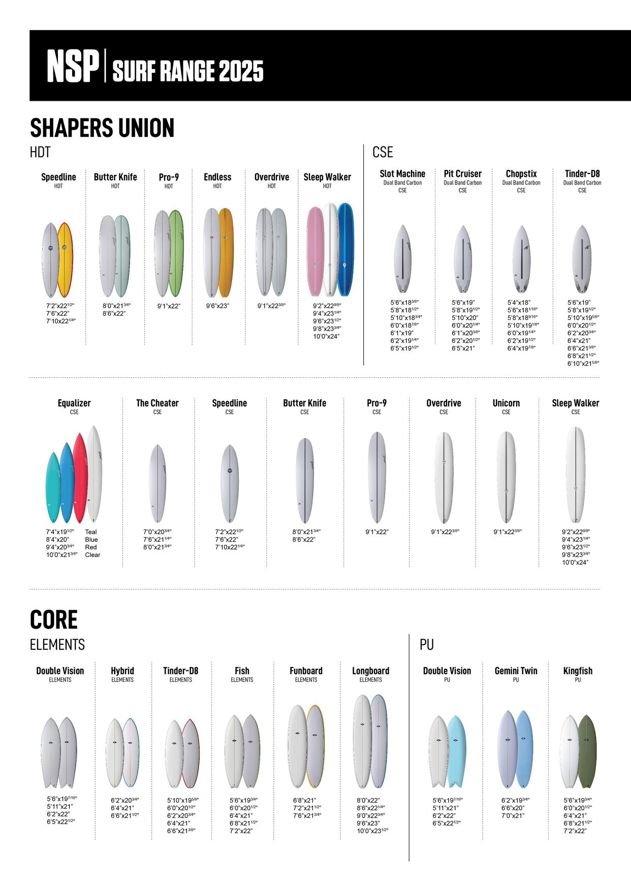 In 2025 the Shapers Union range has been refined to highlight our shapers brands to complement their custom business and allow people from all over the world to experience their boards via NSP’s global distribution.