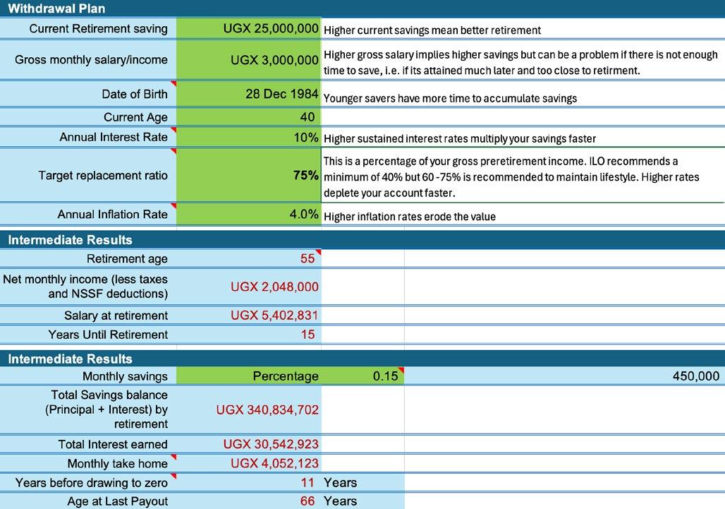 In this example, the saver has UgX 25 million in their retirement account, they earn a net income of UGX 2.04 million from a gross of UGX 3 million while saving 15% of their gross salary each month. Being 40 years of age implies that they have 15 years of saving and compounding of interest before they can draw from their retirement account. In that period, they will be able to grow their savings from the current 25 million to 340 million thanks to interest compounding and the additional savings.