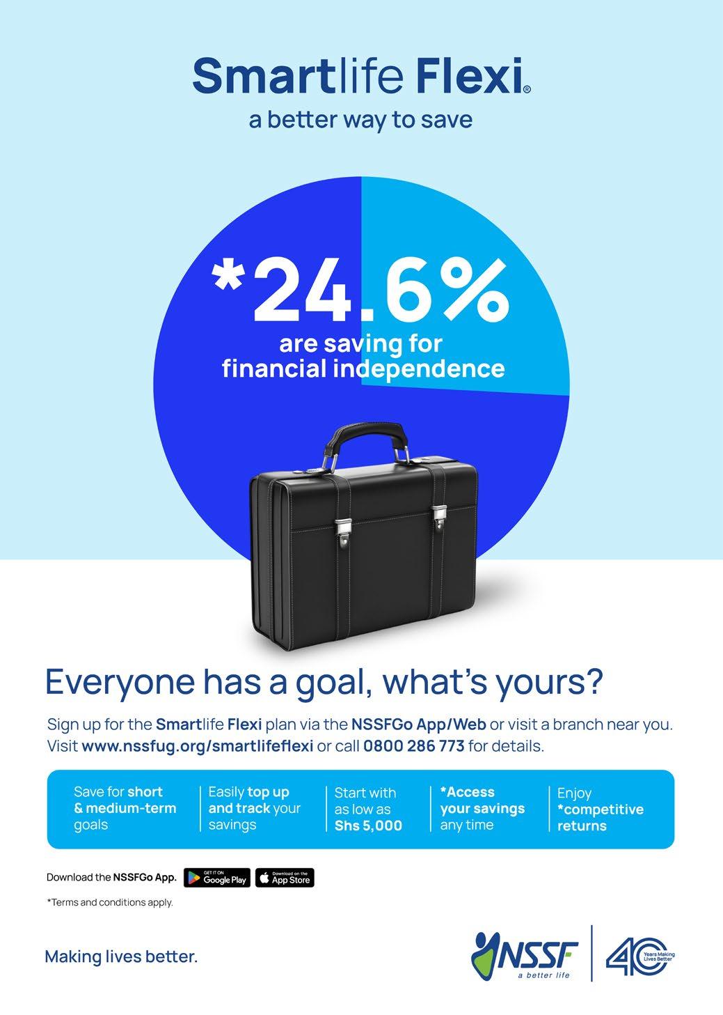 The NSSF SmartLife Flexi is a flexible, goal-driven savings plan designed to help Ugandans achieve their financial goals with the freedom to choose savings period and frequency while earning a competitive monthly return, accrued daily.
