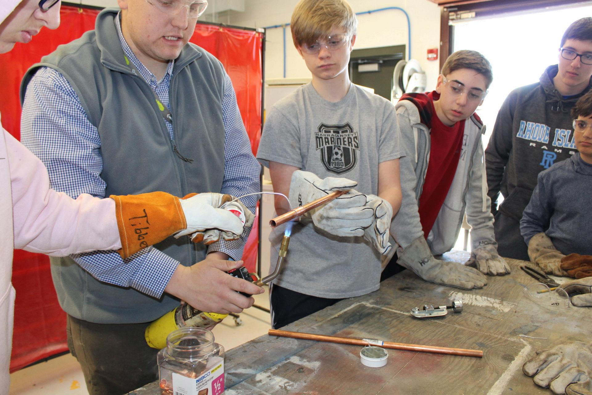 Thison-sitelearningprogramatNarragansettHigh School offers hybrid, multifaceted courses that provide students with opportunities to work with industryleadersatUALocal51Plumbers,Pipefitters, andRefrigerationHVAC,andtocompleteacertified program through National Center for Construction Education & Research The program utilizes a varietyoflearningapproachesthatallowstudentsto work independently, remain engaged in their learningallwhilemakingconnectionstoclassroom learning, and career and postsecondary-related experiences