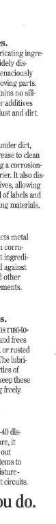 and experiencing firsthand the crippling effects of the salty air. Convair used the Original WD40 Formula to protect the outer skin of the Atlas Missile, which would go onto play a significant role in the early years of the U.S. space exploration program. And while the formula rose to the occasion for which it was designed — both degreasing parts and providing a rust inhibitor to withstand the damp ocean ear — employees at Convair quickly discovered it could be used for a variety of other problem-solving uses from removing gunk from tools to lubricating moving parts, and loosening bolts and nuts.