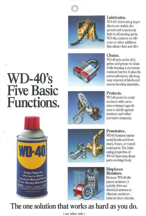 The brand’s cult-like following continued to grow, and during the 1960s, it became ubiquitous among carpenters, machinists, construction professionals and other tradespeople who came to rely on the formula on the job and at home. In 1968, goodwill kits containing WD-40 Multi-Use Product were sent to soldiers in Vietnam to prevent moisture damage on firearms and help keep them in good working condition.