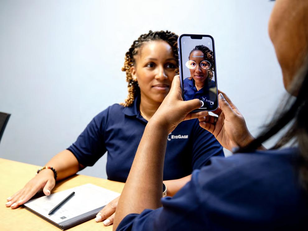 Dr. Brown getting her eyes scanned by the EyeGage app that she invented.