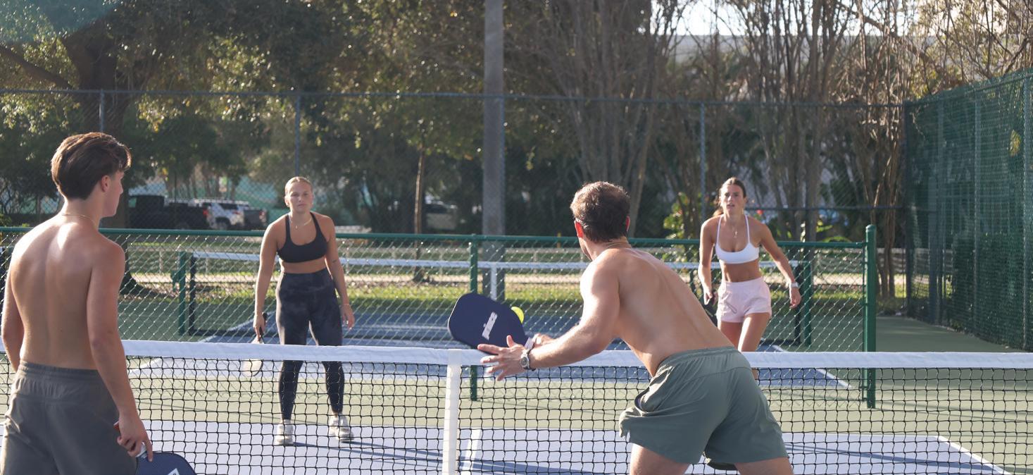 Teams of students play a pickleball match on a court outside the NSU RecPlex.