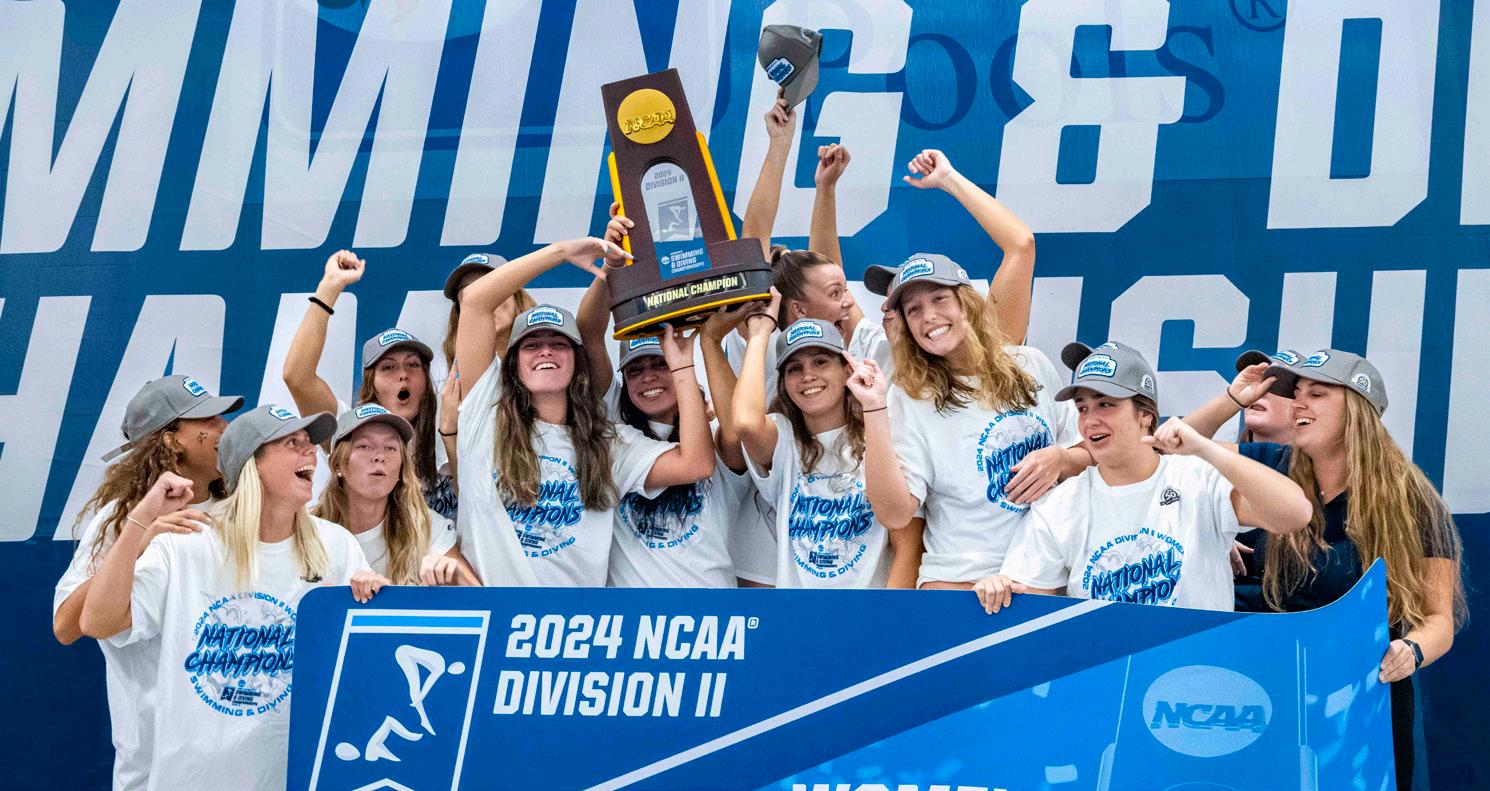For the second year in a row, the women’s swimming team won the NCAA Division II National Championship. The team won six individual NCAA national championships, four by Emily Trieschmann and two by Rafaela Raurich. Trieschmann won SSC Swimmer of the Year and coach Ben Hewitt won SSC Coach of the Year.