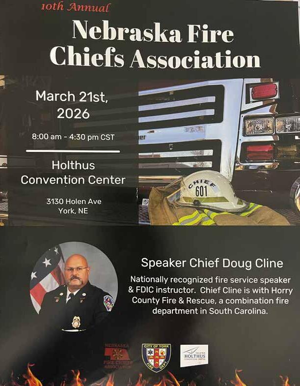 MAR. 21, 2026: 10th Annual Nebraska Fire Chiefs Association, 8 a.m.-4:30 p.m., Holthus Convention Center, 3130 Holen Ave., York, NE. Speaker will be Chief Doug Cline.