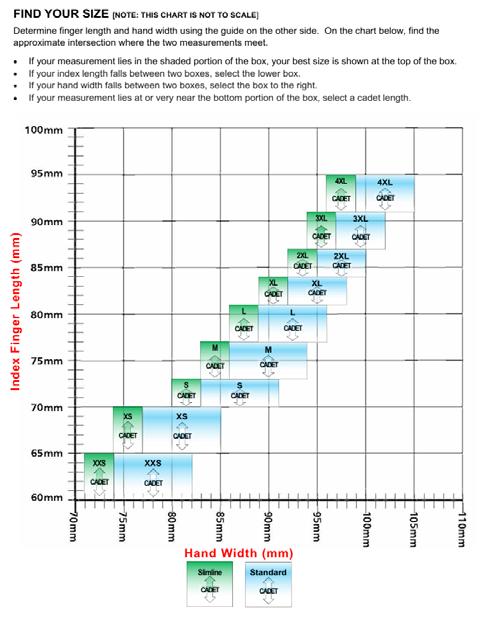According to NFPA 1970-1971 these glove size groupings use a couple of key measurements. First the index finger length in millimeters. Second, hand width. As above, you then match your measurements to the best combination of the 7 options available.
