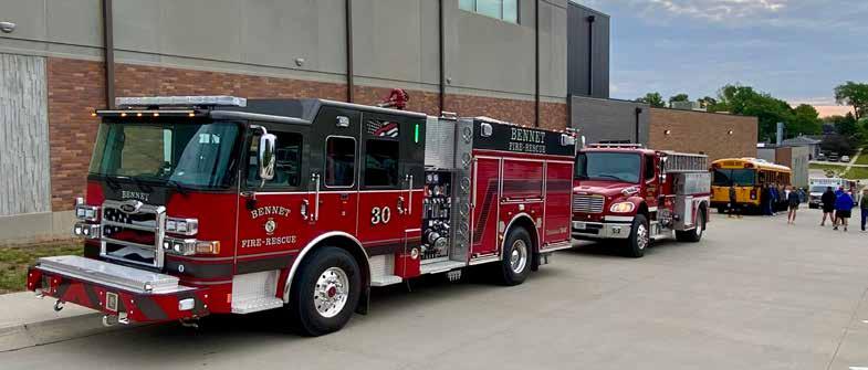 On May 23, 2025, Bennet Fire and Rescue (front left two trucks) and Palmyra Fire and Rescue (back right two trucks behind the bus) lined up to escort Palmyra’s 17 track and field state qualifiers to cheer them on through their journey to the State Track and Field Meet at Burke Stadium in Omaha. Photographer: Karis King. Submitted by: Evan King
