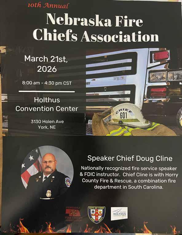 MAR. 21, 2026: 10th Annual Nebraska Fire Chiefs Association, 8 a.m.-4:30 p.m., Holthus Convention Center, 3130 Holen Ave., York, NE. Speaker will be Chief Doug Cline.