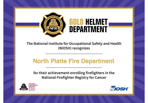 North Platte has achieved 100 percent participation from Career and Volunteer personnel in the NIOSH National Firefighter Cancer Registry. “I am proud of our personnel and their commitment to understanding and reducing cancer risk in the fire service,” said Dennis Thompson, Fire Chief, North Platte Fire Department.