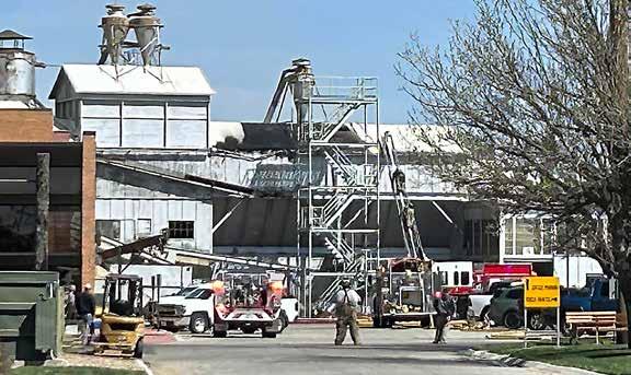 Firefighters from Fair- bury Rural Fire Department responded to a mutual aid request from Beatrice Fire and Rescue on Friday, March 19, to help battle at the old Dempsters Manufacturing facility in Beatrice. The building was heavily damaged. Some firefighters were still at the scene as of Monday, March 24, and could be seen spraying water on the building.