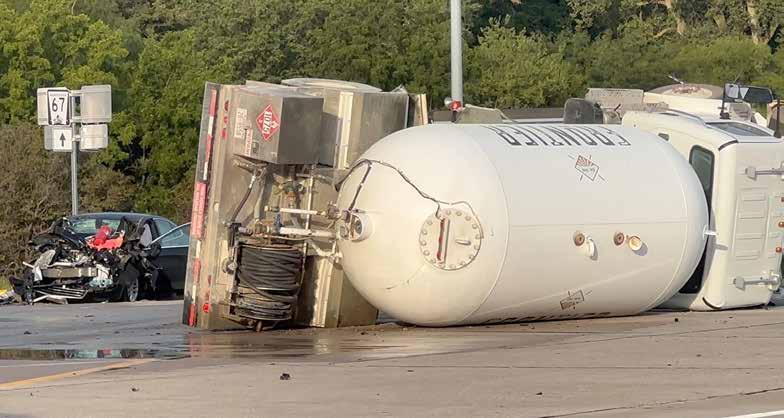 Passersby are credited with assisting the driver of a Chevy Malibu and firefighters shut off propane leak on a tanker after a collision August 25 at the intersection of Highway 2 and Highway 67. A motorist that stopped to assist said someone used a fire extinguisher to put out flames on the overturned truck. Rick Dornburg of Malvern, a former firefighter, said it seems he was the first driver to stop after the accident. He said he saw flames on the truck and had a fire extinguisher available because he is in the fire safety business for commercial kitchen customers. He said he used a 10 lb. ABC extinguisher to put out the fire. He turned his attention to the driver of the truck and attempted to break through the windshield to get to the driver. He went back to his vehicle to get a hammer, and another motorist joined him in peeling back the windshield so the driver could get out. Dornburg said his attention was directed to another fire on the truck, which he also put out.