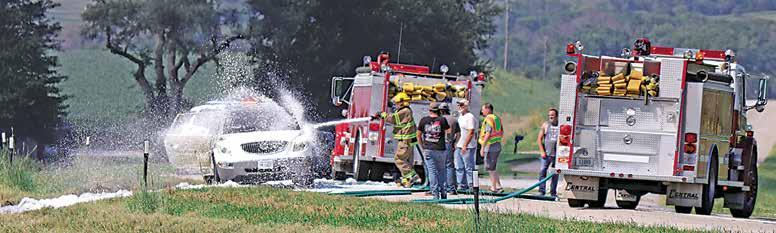 Falls City Fire Department arrived to find a car fully engulfed in flames. Engine #32 firefighters applied a heavy stream of water, then injected liquid foam to knock down the flames and prevent the fire from spreading. After the booster tank was emptied, crews switched to a second