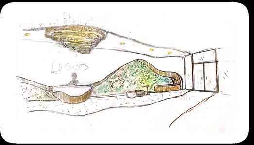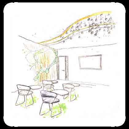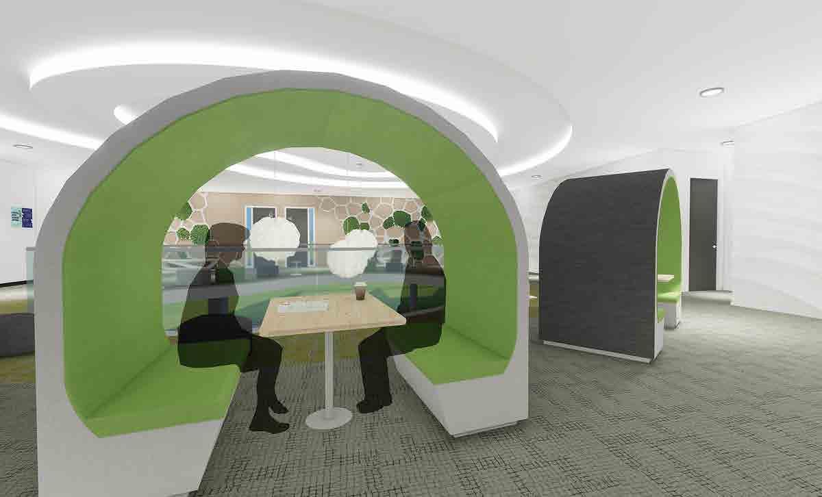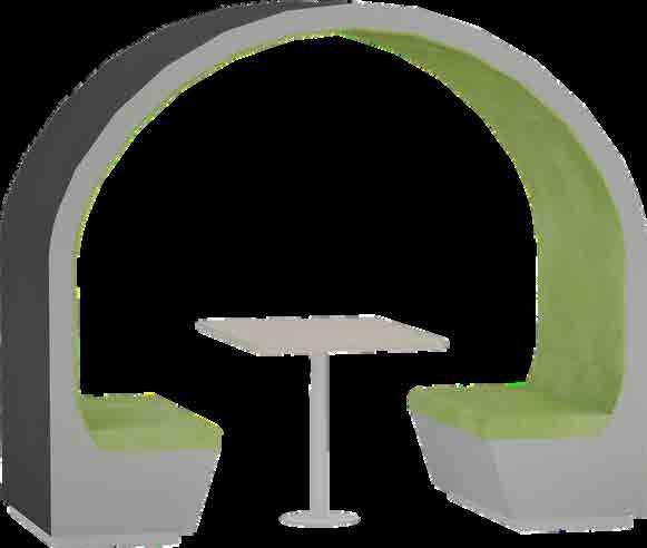 Seating pod, inspired by bridges of Big Chico Creek. Upholstered seating, inspired by creek pebbles.