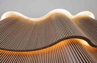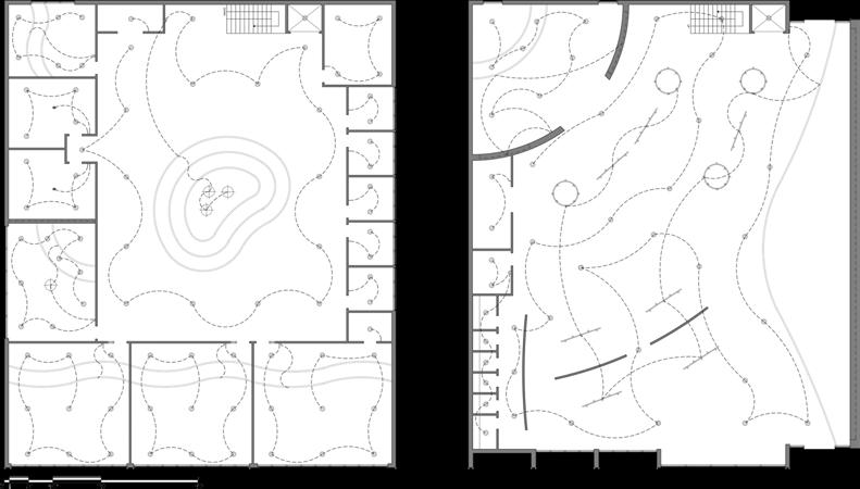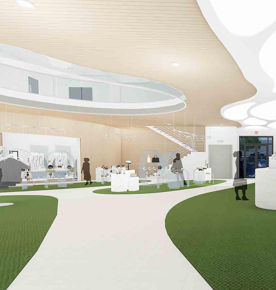 The second floor’s lounge radiates around an atrium that opens up to the first floor, so clients are able to glimpse the merchandise down below as they head to and form the classroom facilities. A variety of organic, pebble-shaped upholstered seating are sprinkled throughout the space can be easily moved to different areas, much inspired by the movement of stones and pebbles scattered throughout the Big Chico Creek. Additionally, custom “bridge” pods allow individuals to sit either independently or with others as the overhead curvature provides semi-private zones in lounge area.