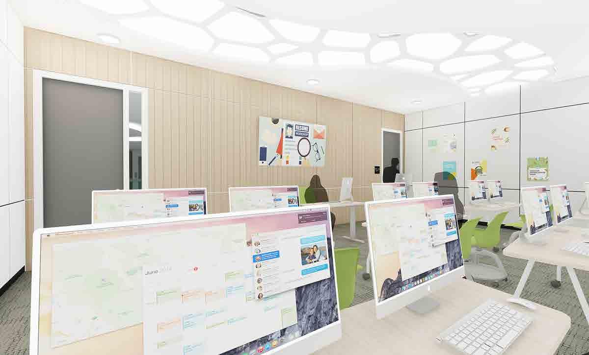 During hours where the computer lab is not hosting any workshops or activities, it is available for clients to use if they wish to work on their resume or other important documents. Whiteboard paneling and AcoustiTack paneling are applied to two different walls in each room to allow for more teaching versatility and activities, as well as enhancing the learning process.